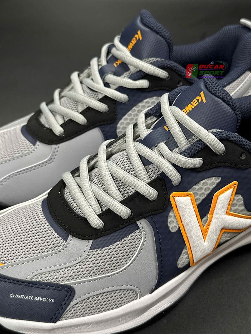 Giày Cầu Lông Kawasaki 3338 với sự kết hợp giữa tông Xám ở phần mũi/lưới và Xanh Than ở phần gót/viền tạo nên vẻ ngoài sạch sẽ, ít lộ vết bẩn nhưng không hề nhàm chán. Chi tiết đắt giá nhất của giày chính là logo chữ "K" và các đường viền nhỏ màu Vàng Cam. Sự tương phản này giúp đôi giày trở nên nổi bật, trẻ trung và khỏe khoắn hơn hẳn. Nó xóa tan định kiến về những đôi giày Kawasaki "nồi đồng cối đá" thường có thiết kế thô kệch.