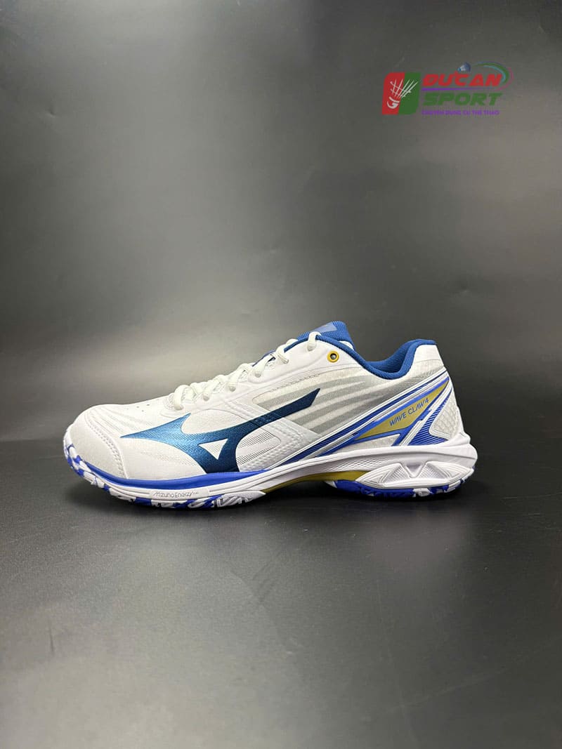 Ấn tượng đầu tiên về Mizuno Wave Claw 4 Trắng Xanh Dương chính là phối màu cực kỳ bắt mắt. Sự kết hợp giữa tông nền trắng chủ đạo cùng các chi tiết xanh dương đậm tạo nên cảm giác trẻ trung, năng động nhưng không kém phần sang trọng.