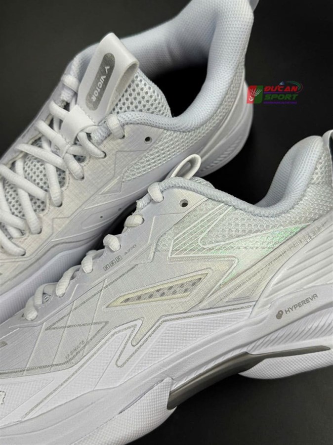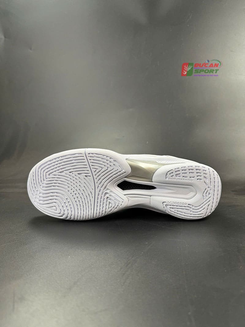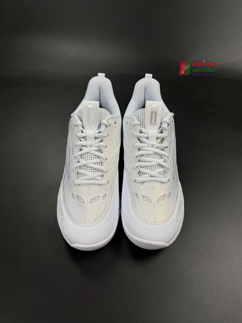 Toàn bộ đôi giày được bao phủ bởi tông màu Trắng chủ đạo. Khác với màu trắng đục, tông trắng này có độ sáng cao, mang lại cảm giác sạch sẽ, sang trọng và rất "bắt" ánh đèn trên sân. Điểm xuyết trên nền trắng là các họa tiết logo Victor và đường viền màu Xám Bạc. Sự kết hợp giữa Trắng và Bạc tạo nên hiệu ứng "Tone-sur-tone" cực kỳ thời thượng, không bao giờ lỗi mốt.