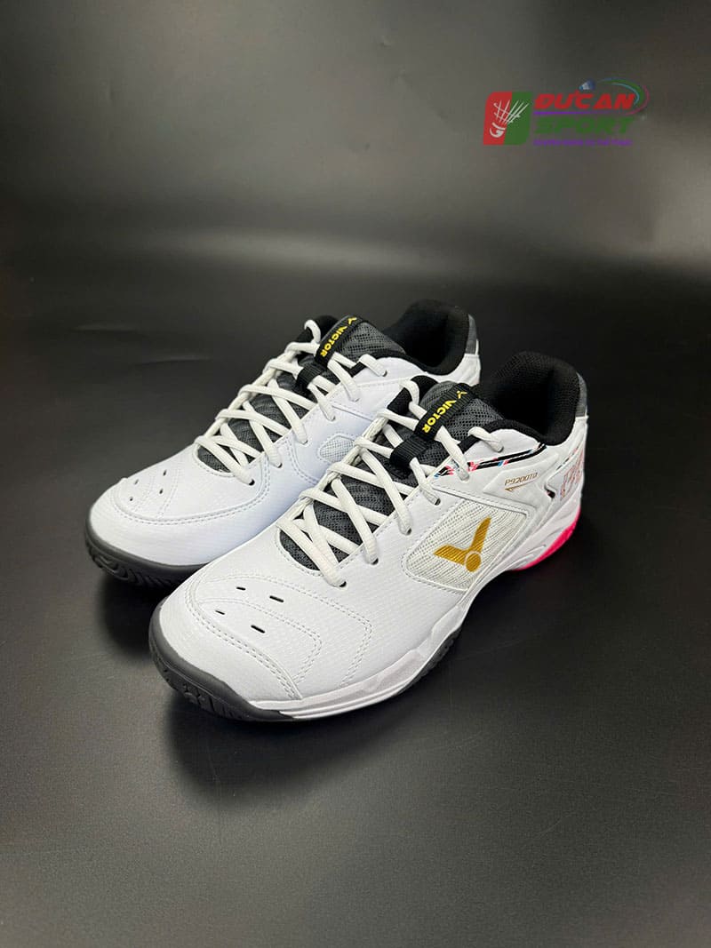 Phiên bản P9200TD AH sở hữu vẻ ngoài cực kỳ nịnh mắt. Tông màu trắng tinh khôi làm nền cho logo Victor màu vàng kim sang trọng ở thân giày. Điểm nhấn phá cách chính là phần gót giày màu hồng neon và các chi tiết viền tinh xảo, tạo nên một đôi giày vừa có nét mạnh mẽ của thể thao, vừa có sự mềm mại, thời trang.