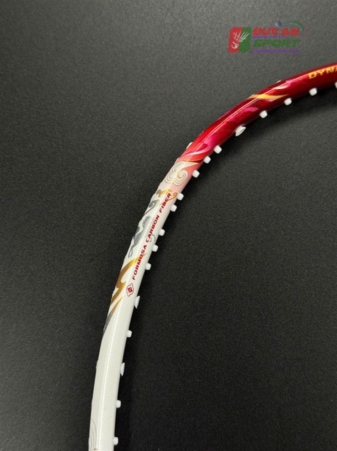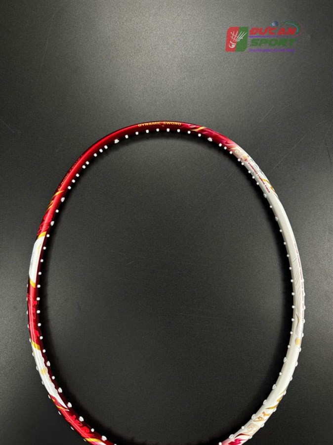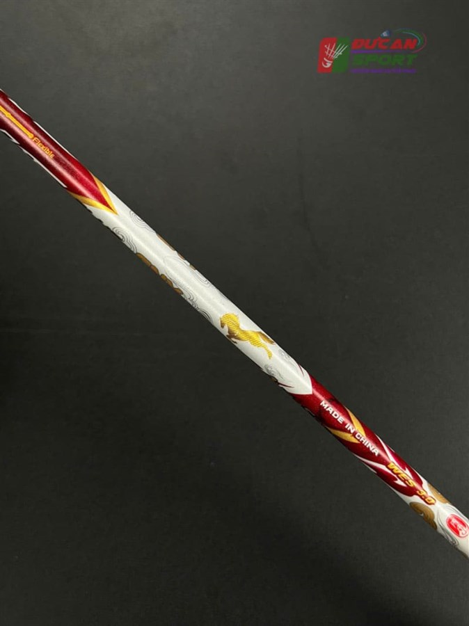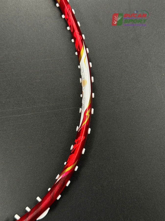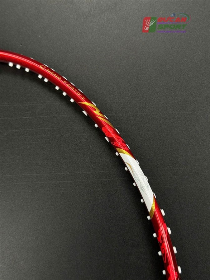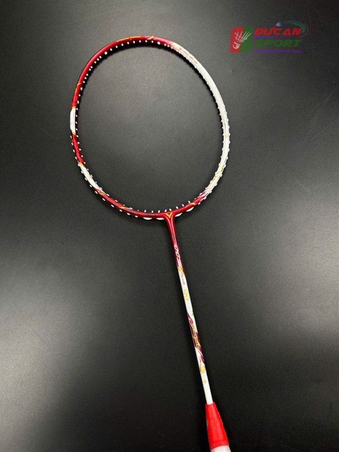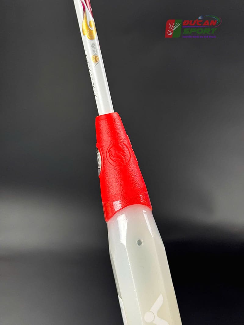 - Phối màu: Vợt sở hữu tông màu trắng ngọc trai làm nền ở thân và khung, điểm xuyết các họa tiết màu đỏ rực và vàng kim loại. Sự kết hợp này tạo nên cảm giác thanh thoát nhưng vẫn đầy quyền lực. Phần chụp mũ vợt có màu đỏ trong suốt, để lộ công nghệ cán cầm bên trong, tạo điểm nhấn hiện đại.