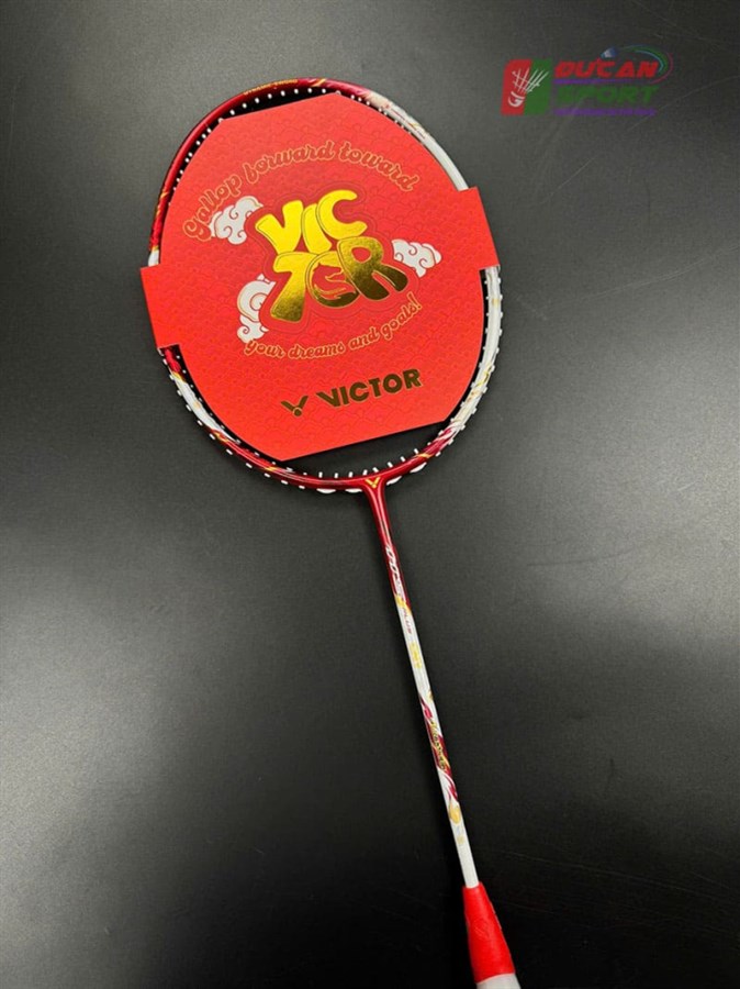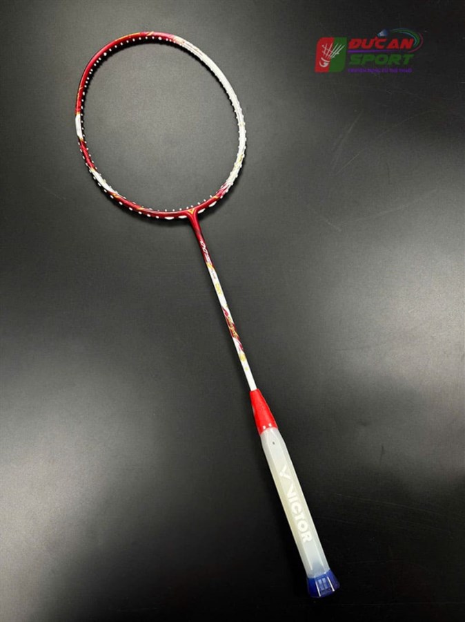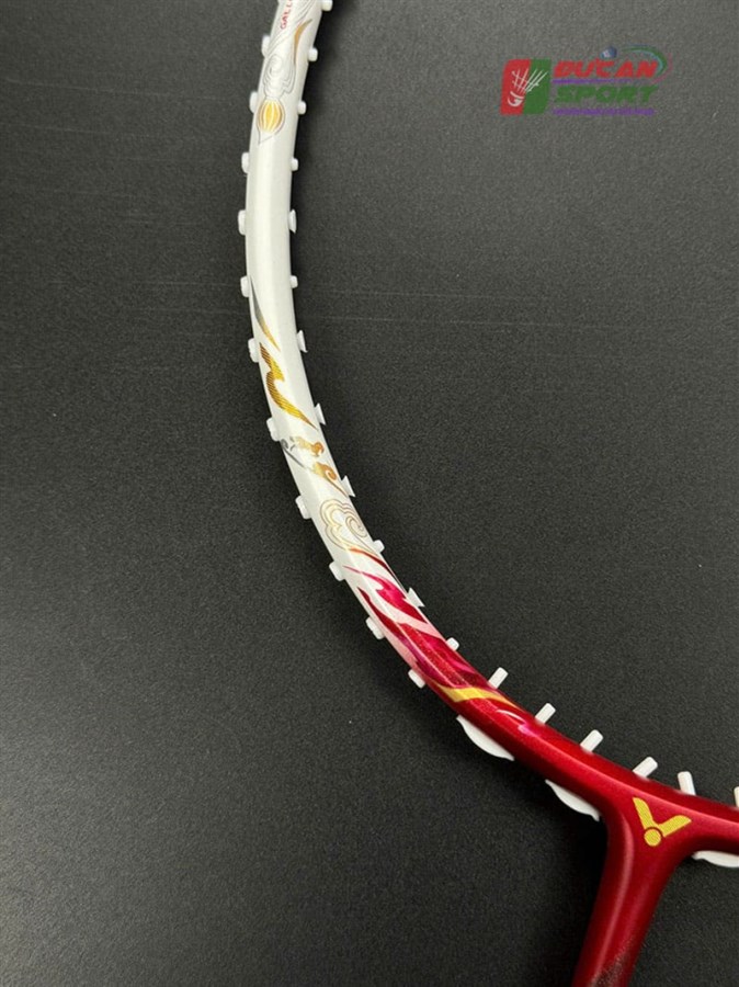 - Họa tiết: Các chi tiết hoa văn mây cổ và thư pháp được lồng ghép khéo léo dọc theo khung vợt. Logo Victor màu vàng kim sáng bóng đặt ngay khớp chữ T khẳng định vị thế thương hiệu.
