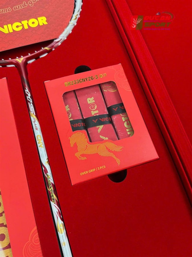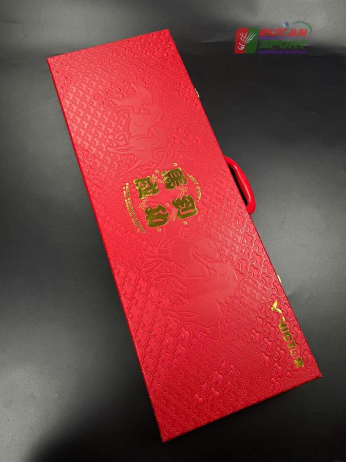 Set Vợt Cầu Lông Victor AuraSpeed HS-PLUS CNY Limited được đặt trong một chiếc hộp hình chữ nhật lớn, cứng cáp với tông màu Đỏ chủ đạo – màu sắc tượng trưng cho sự may mắn, tài lộc và hạnh phúc trong văn hóa phương Đông. Trên mặt hộp là các họa tiết in nổi màu vàng kim cực kỳ tinh xảo. Nổi bật là dòng chữ Hán cách điệu cùng hình tượng chú ngựa đang phi nước đại. Điều này gợi nhắc đến câu chúc "Mã Đáo Thành Công", rất phù hợp cho năm Ngọ.