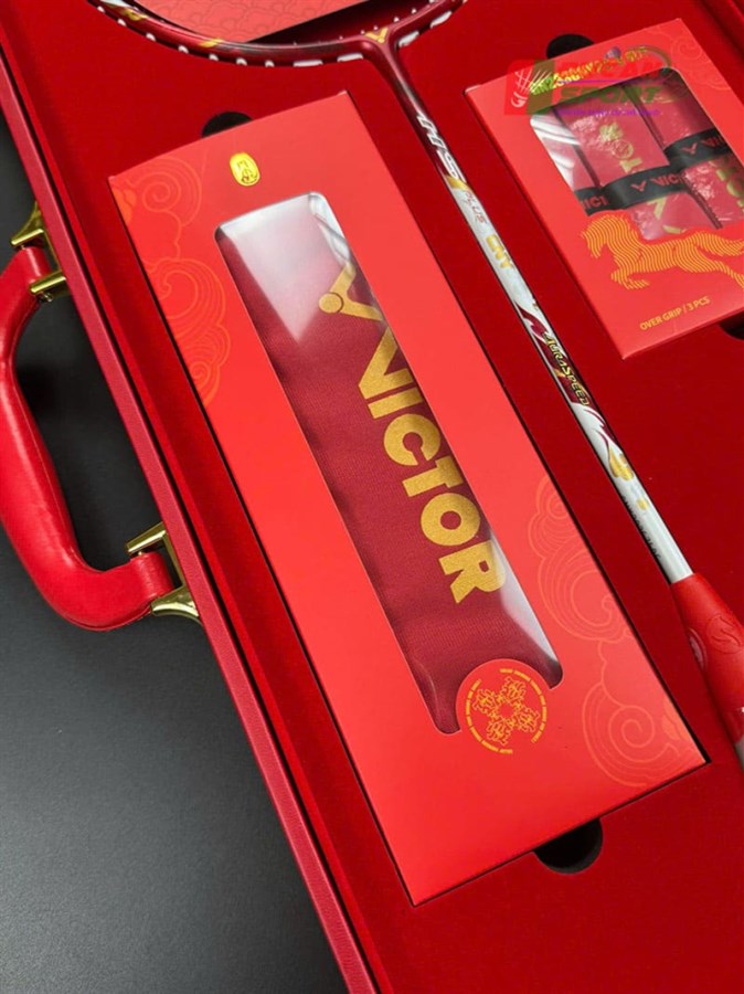 - Túi nhung đỏ: Một túi đựng vợt bằng vải nhung cao cấp màu đỏ, in logo Victor vàng, bảo vệ vợt khỏi trầy xước.