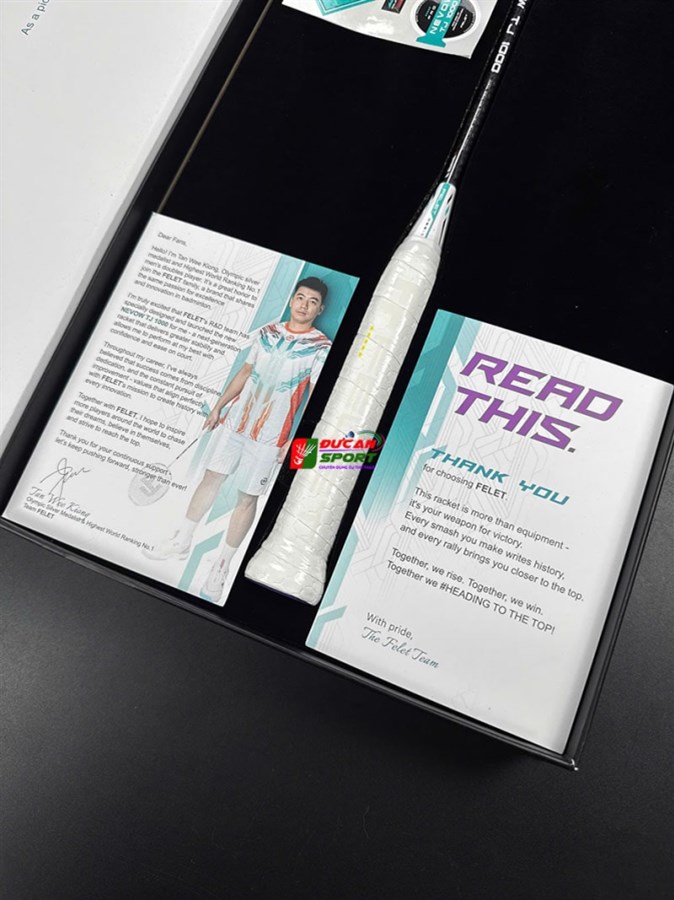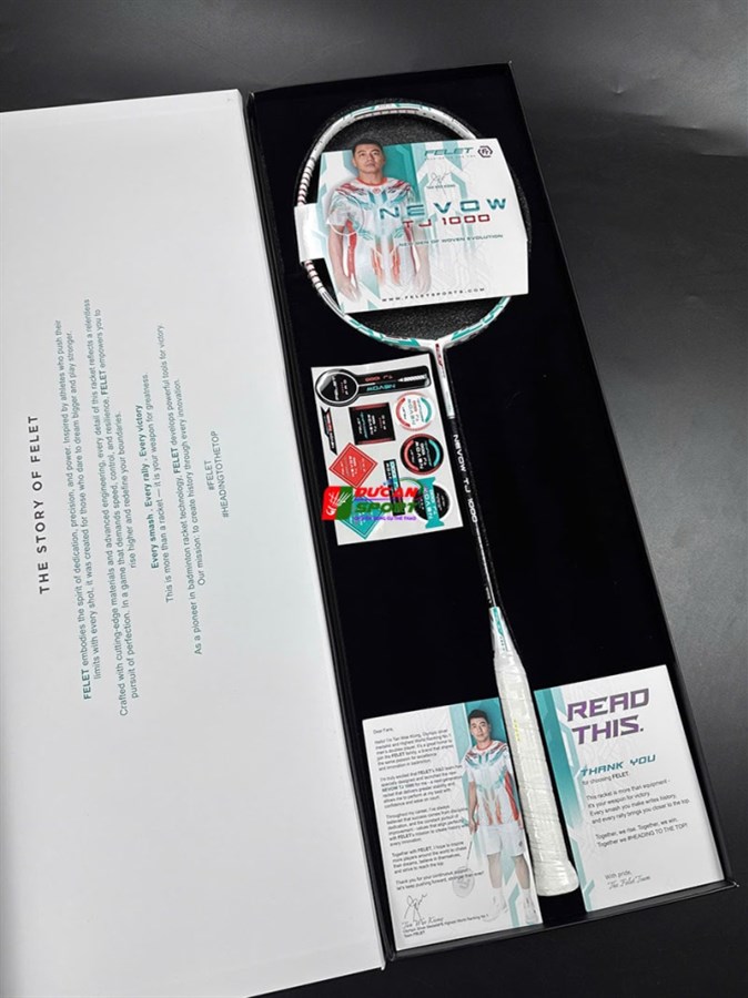 Vợt đi kèm một chiếc hộp chữ nhật dài được thiết kế riêng với các họa tiết mạch điện tử cách điệu. Trên hộp in rõ logo Felet và tên dòng vợt "NEVOW TJ 1000". Điều này cho thấy đây là dòng sản phẩm cao cấp, rất thích hợp để làm quà tặng hoặc sưu tầm.