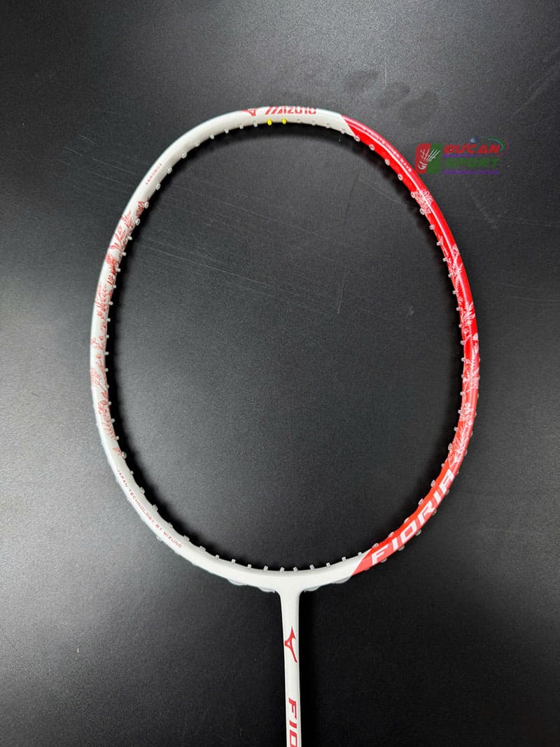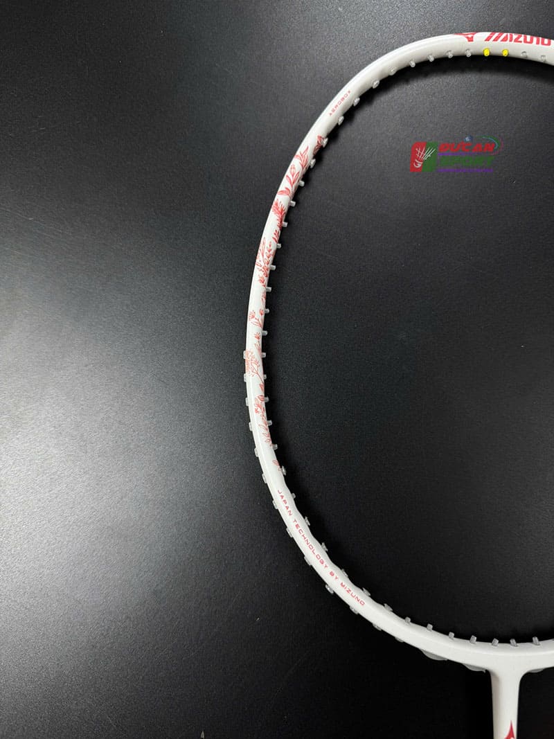 Điểm ấn tượng đầu tiên khi nhìn vào Vợt Cầu Lông Mizuno Fiora Lite chính là ngôn ngữ thiết kế hiện đại, trẻ trung nhưng không kém phần sang trọng. Mizuno đã rất khéo léo khi sử dụng tông màu trắng làm chủ đạo bao phủ toàn bộ khung và thân vợt. Màu trắng tượng trưng cho sự thanh thoát, nhẹ nhàng – đúng như cái tên "Lite" của nó. Điểm xuyết trên nền trắng nhã nhặn ấy là các họa tiết màu đỏ rực rỡ chạy dọc theo khung vợt.