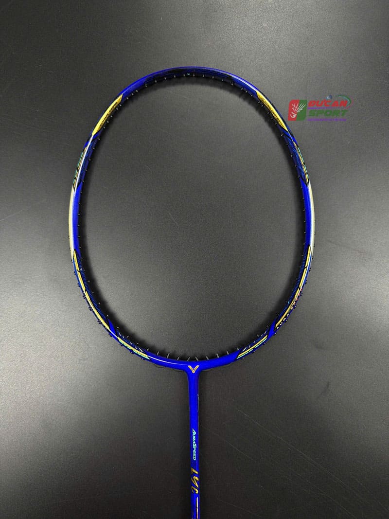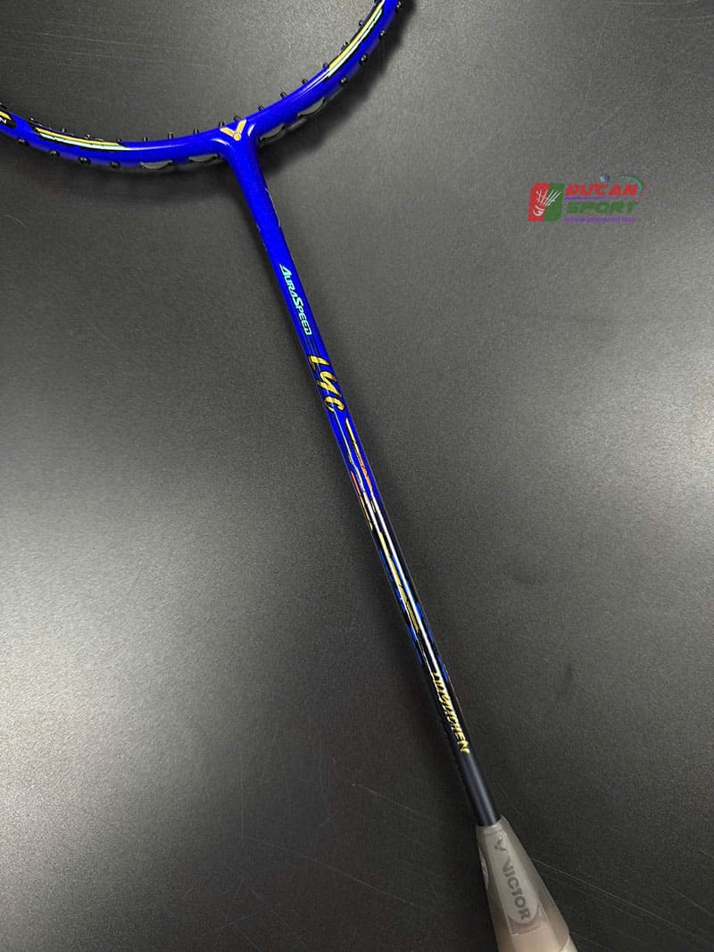 Ngay từ cái nhìn đầu tiên, Vợt Cầu Lông Victor AuraSpeed LYC Limited toát lên một khí chất vương giả nhưng đầy bí ẩn. Toàn bộ khung và thân vợt được phủ lớp sơn màu Xanh Than. Đây là tông màu trầm, mang lại cảm giác mạnh mẽ, lì lợm và rất sạch sẽ, khó lộ vết xước. Các chi tiết decal và logo Victor được mạ màu Vàng Gold và Bạc chạy dọc theo khung vợt và trục vợt. Sự tương phản này không quá phô trương nhưng đủ để khẳng định đây là dòng vợt cao cấp.