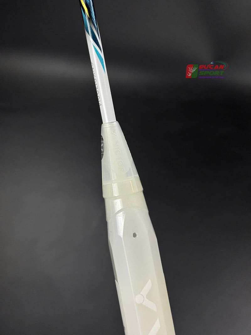 Khác với màu sắc sặc sỡ của đời đầu, Vợt Cầu Lông Victor Jetspeed S 12 II khoác lên mình "bộ cánh" hiện đại và trầm tính hơn nhưng vẫn cực kỳ nổi bật. Với có màu chủ đạo là sắc Đen nhám bao phủ phần khung kết hợp với các họa tiết màu Xanh Ngọc tạo cảm giác mát mắt nhưng đầy năng lượng. Các chi tiết decal màu Vàng Kim và các đường vát sắc sảo chạy dọc thân vợt tôn lên vẻ sang trọng, quý phái, xứng tầm với phân khúc cao cấp. Điểm đặc biệt nhất có thể thấy rõ trong hình là phần chóp cán (Cone) màu trắng đục. Đây là dấu hiệu nhận biết của công nghệ tay cầm Free Core – một cuộc cách mạng trong thiết kế vợt của Victor.